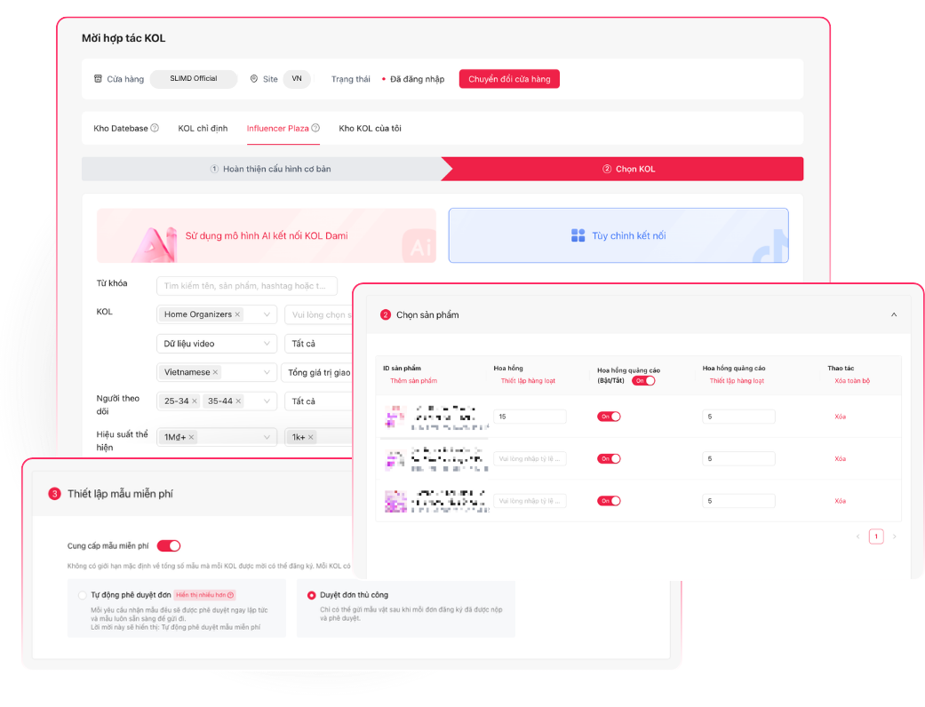 ❖ Điều chỉnh hoa hồng & hàng mẫu: Toàn quyền tùy chỉnh mức hoa hồng, số lượng hàng mẫu theo từng sản phẩm hoặc từng creator để tối ưu chi phí và tăng tỉ lệ nhận lời mời.