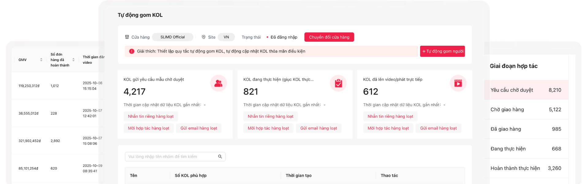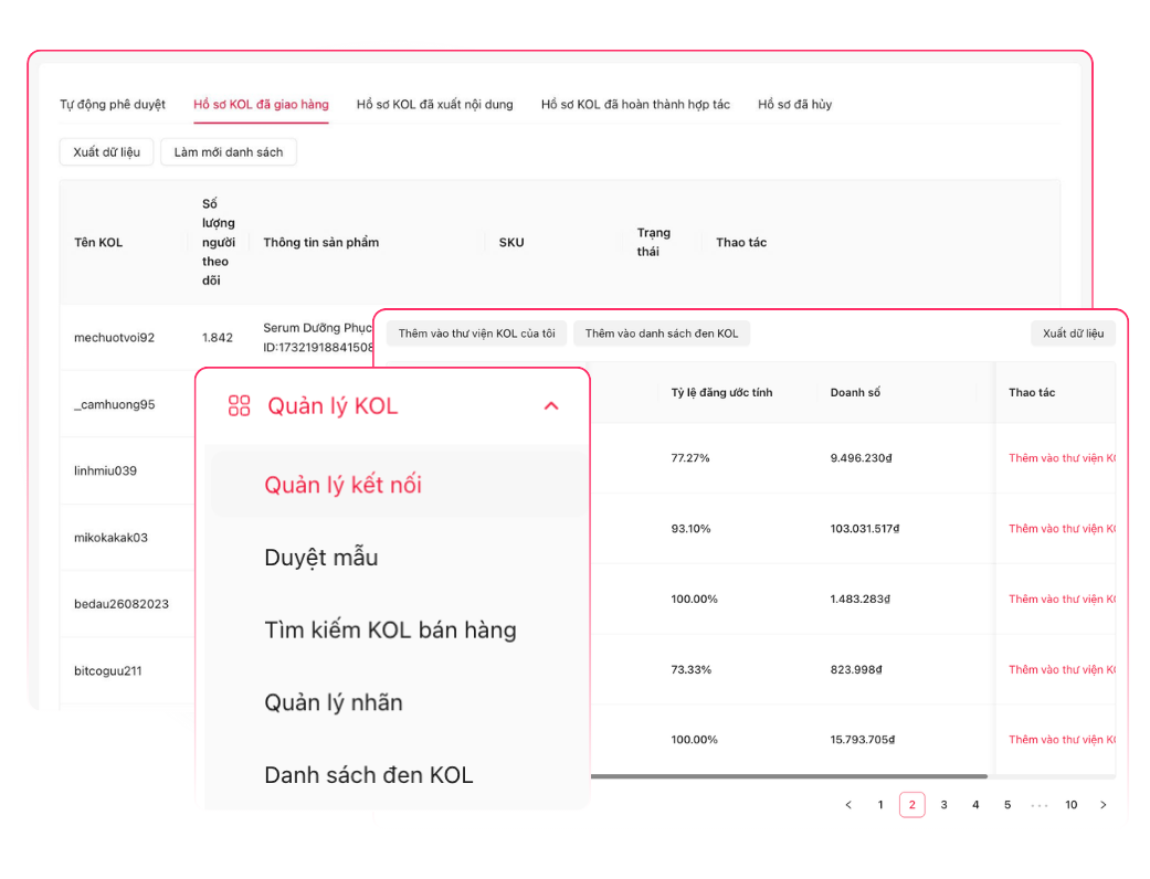 ❖ Quản lý tiến độ gửi hàng mẫu: Theo dõi toàn bộ quá trình gửi hàng mẫu – từ chuẩn bị, vận chuyển đến khi creators xác nhận – đảm bảo chiến dịch diễn ra trơn tru và đúng thời gian.